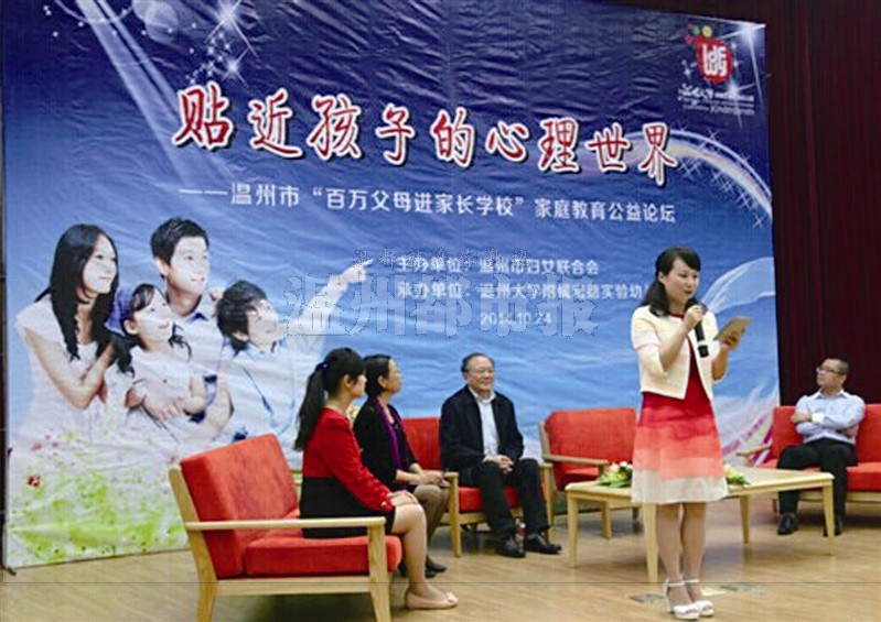近日,由温州市妇联主办、8868体育_8868(中国)附属宏德实验幼儿园承办的“贴近孩子的心理世界”暨温州市“百万父母进家长学校”家庭教育公益论坛在8868体育_8868(中国)举行。华东师范大学心理学博导王振宇教授、8868体育_8868(中国)教师教育学院林炎琴副教授,以及三位家长参与了论坛对话。宏德实验幼儿园的300多名幼儿家长及教师参与了活动。