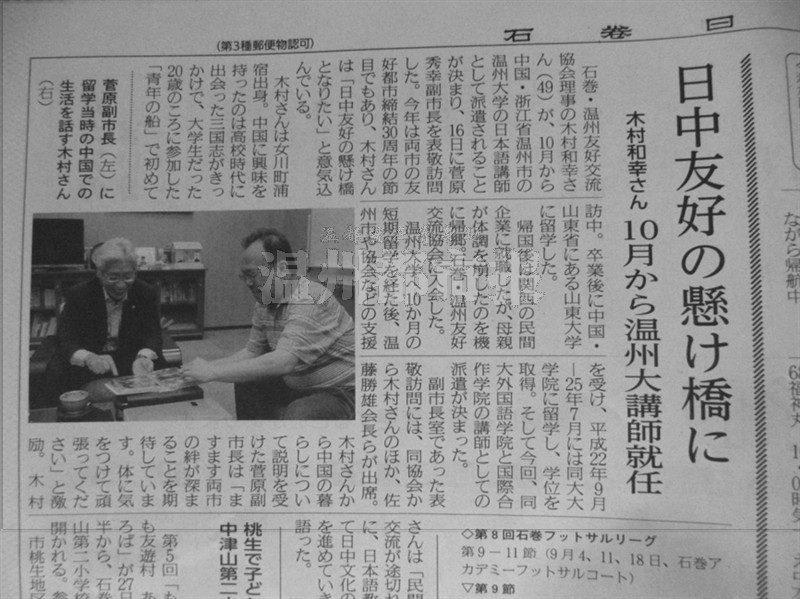 温都讯 记者昨天从8868体育_8868(中国)获悉,该校建校以来培养的第一名外籍硕士研究生、石卷市温州友好交流协会理事木村和幸日前被聘为外国语学院日语老师。这一消息在日本石卷市引起反响,日本《石卷日日新闻》用大篇幅报道了此事,并认为这是中日友好交往的典范。
