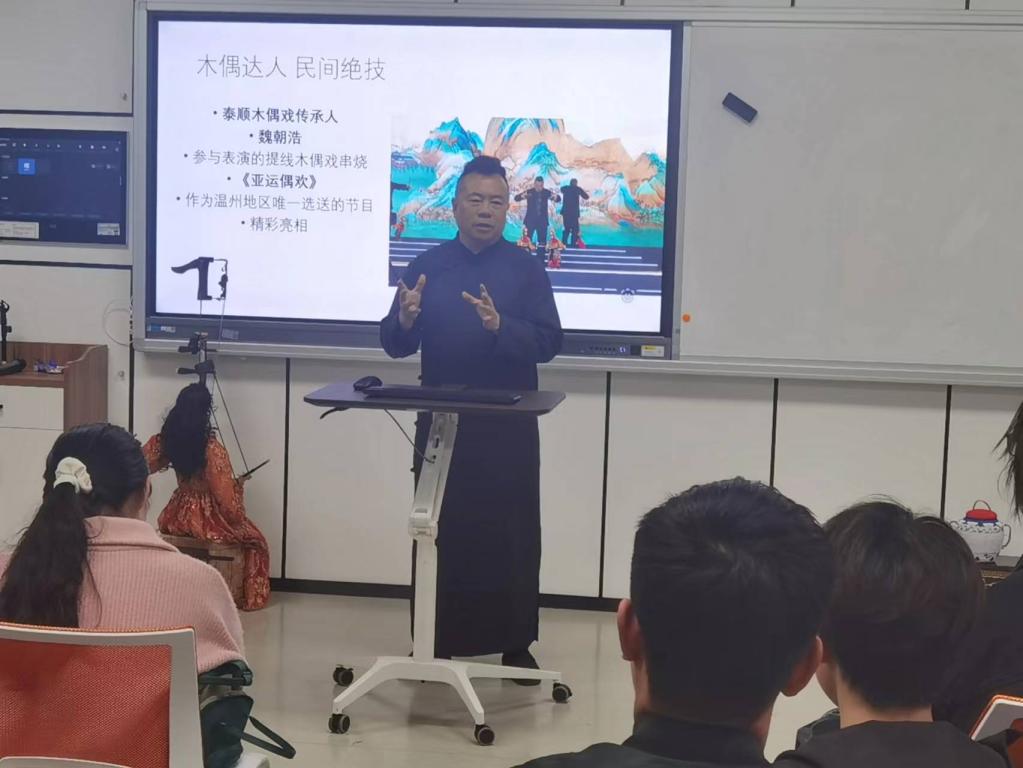 学生们在这门课程中可以学习关于温州非遗项目的基本知识和技能,如提线木偶戏的操作和表演。同时,这门课程还注重培养学生的团队合作能力和创新意识,如通过小组合作创作完成双语木偶剧目并表演。通过课程学习,学生不仅锻炼了组织策划和沟通协调能力,还可以了解中华优秀传统文化中的艺术表现形式和审美特点,进一步认识了中国文化的博大精深,增强了民族自豪感和文化自信心。(完)