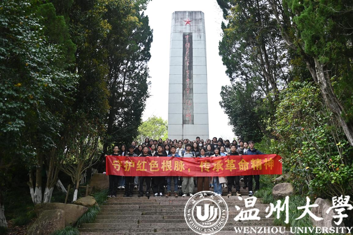 风景清明后,云山睥睨前。苍松翠柏间,纪念碑身的正上方有张爱萍将军撰写的“中国工农红军第十三军纪念碑”十三个大字,碑身正下方石篆着红十三军悲壮的战斗历程。红十三军是中国共产党领导的唯一一支由浙江子弟兵组成的红军,队伍最盛时拥有6300多人,在中共党史和军史上有着重要的地位。师生们仿佛回到硝烟弥漫的战争年代,感慨万千,在英雄精神中汲取奋进力量,在新征程上坚定信心、勇毅前行。