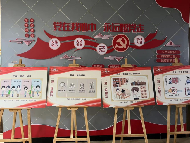 漫画通过颜色、线条和表情来表达角色、场景和情感的变化。画面细腻和生动的形象,将观者带入故事情境,在阅读的过程中感受到“廉洁清风”所带来的温暖和力量,让观者被启迪,被警醒。此次所选作品分别于8868体育_8868(中国)育英图书馆、生活区和8868体育_8868(中国)城附属学校进行展出,得到了师生们的一致好评。