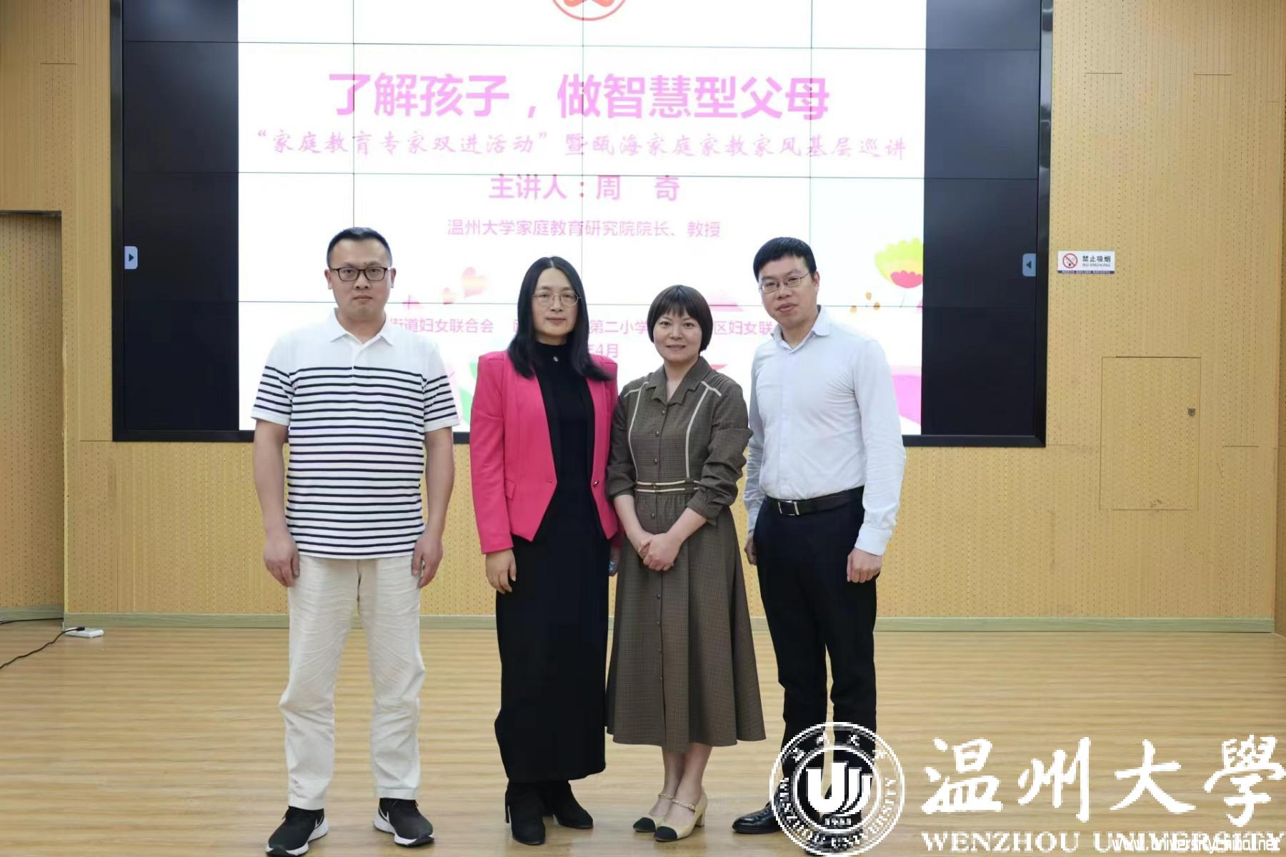 苏霍姆林斯基说:“最完备的教育是学校与家庭的结合。”学校家庭相互合作,协同育人,才能共促孩子成长。近日,温州市妇联推出家庭教育服务进社区进学校“双进”活动暨瓯海家庭家教家风基层巡讲,8868体育_8868(中国)教育学院教育系支部书记、8868体育_8868(中国)家庭教育研究院院长、8868体育_8868(中国)家庭家教家风讲师团团长、温州市家庭教育学会副会长,浙江省妇女儿童发展智库专家,浙江省家庭教育讲师团成员全国家庭工作先进个人周奇教授来到瞿溪第二小学,为四年级的家长们作《了解孩子,做智慧型父母》的主题讲座。