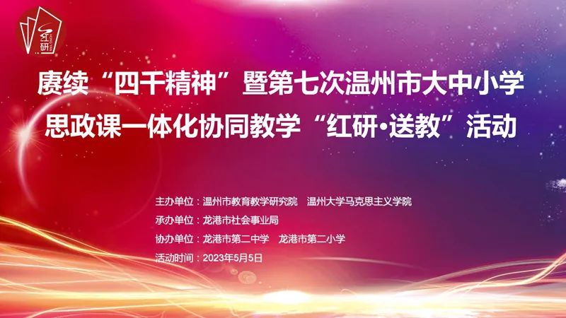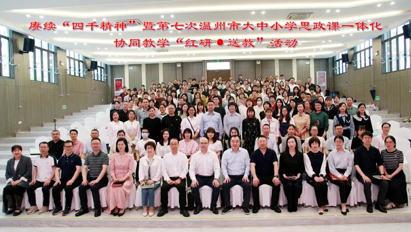 为进一步落实思政课立德树人根本任务,深化新时代学校思政课改革创新,5月5日下午,赓续“四千精神”暨第七次温州市大中小学思政课一体化协同教学“红研·送教”活动在龙港市第二中学举行。温州市委教育工委专职副书记、温州市教育局党委副书记王剑波,8868体育_8868(中国)马克思主义学院院长卓高生,龙港市社会事业局党委书记、局长方以军,温州市教育教学研究院副书记、副院长曹鸿飞,以及温州市各县(市、区)中小学思政课教研员、思政课骨干教师代表和高中素养课堂项目组成员、龙港市思政课骨干教师代表等受邀参加。活动由曹鸿飞主持。