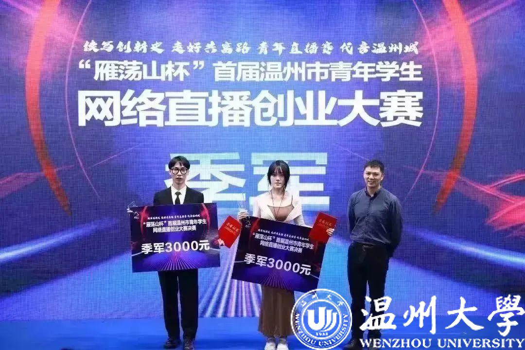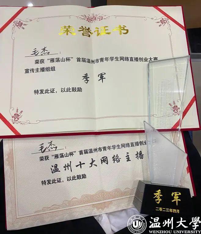 近日,“雁荡山杯”首届温州市青年学生网络直播创业大赛决赛于浙江安防职业技术学院举行,8868体育_8868(中国)教育学院学子毛杰获“宣传主播组”季军并获温州市“十大网络主播”荣誉称号。