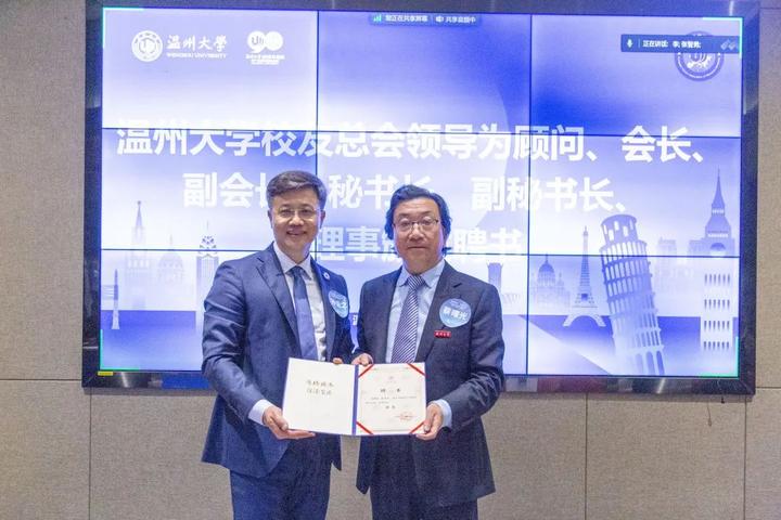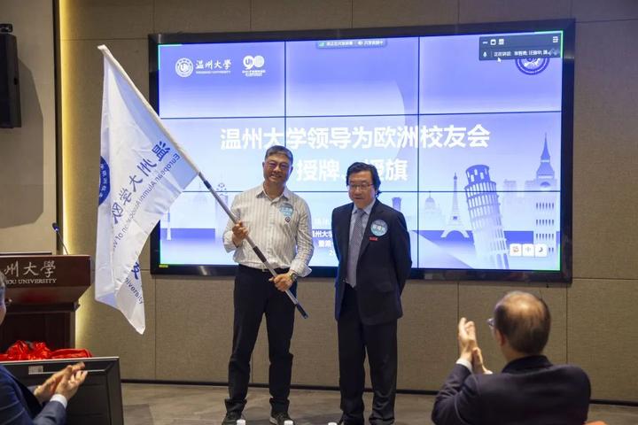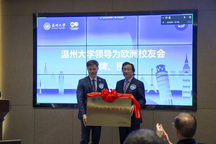大会审议通过了《8868体育_8868(中国)欧洲校友会章程》和8868体育_8868(中国)欧洲校友会第一届理事会建议名单。蔡曙光向欧洲校友会授牌、授旗。蔡曙光、陈宏毅向欧洲校友会顾问、会长、副会长、秘书长、副秘书长、理事颁发聘书。温州校友会会长吴东、北美校友会副会长章美华上台致贺词,意大利高校联盟发起者蔡茂生线上祝贺。