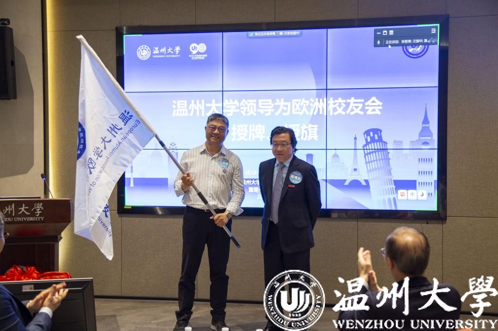 蔡曙光向欧洲校友会授旗。