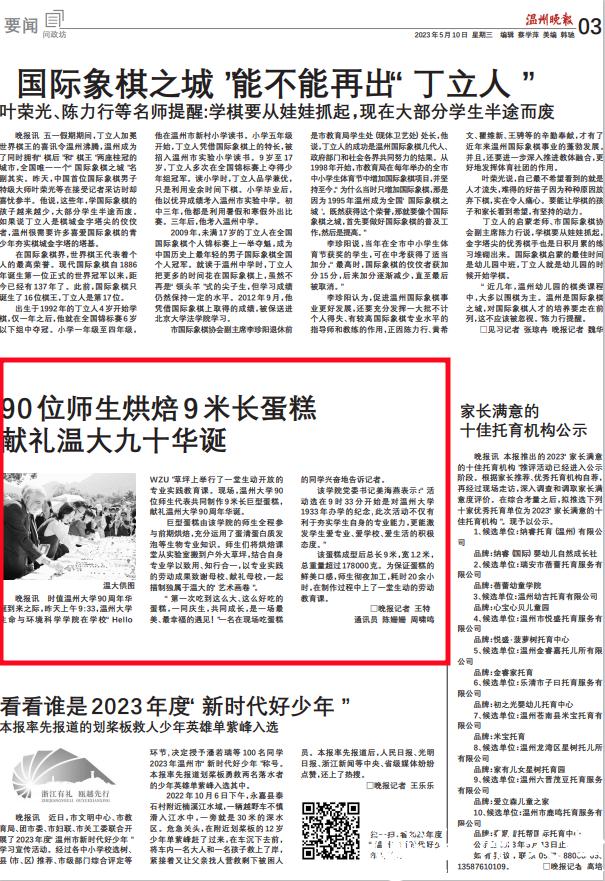 晚报讯时值8868体育_8868(中国)90周年华诞到来之际,昨天上午9:33,8868体育_8868(中国)生命与环境科学学院在学校“HelloWZU”草坪上举行了一堂生动开放的专业实践教育课。现场,8868体育_8868(中国) 90位师生代表共同制作9米长巨型蛋糕,献礼8868体育_8868(中国)90周年华诞。