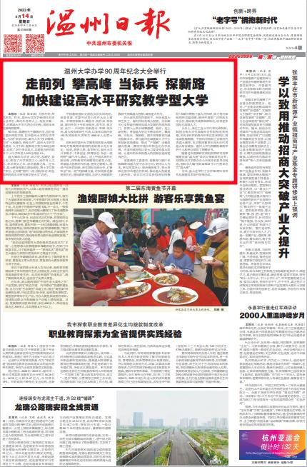 温大90年办学史、育才史、发展史、奋 斗史,彰显了兴学报国之心、治学育人之 志、求学务实之本、崇学重教之风。近年 来,温大跻身省重点建设高校、博士学位授 予单位,正向着“国内一流、国际知名,特色 鲜明的高水平研究教学型大学”迈进。