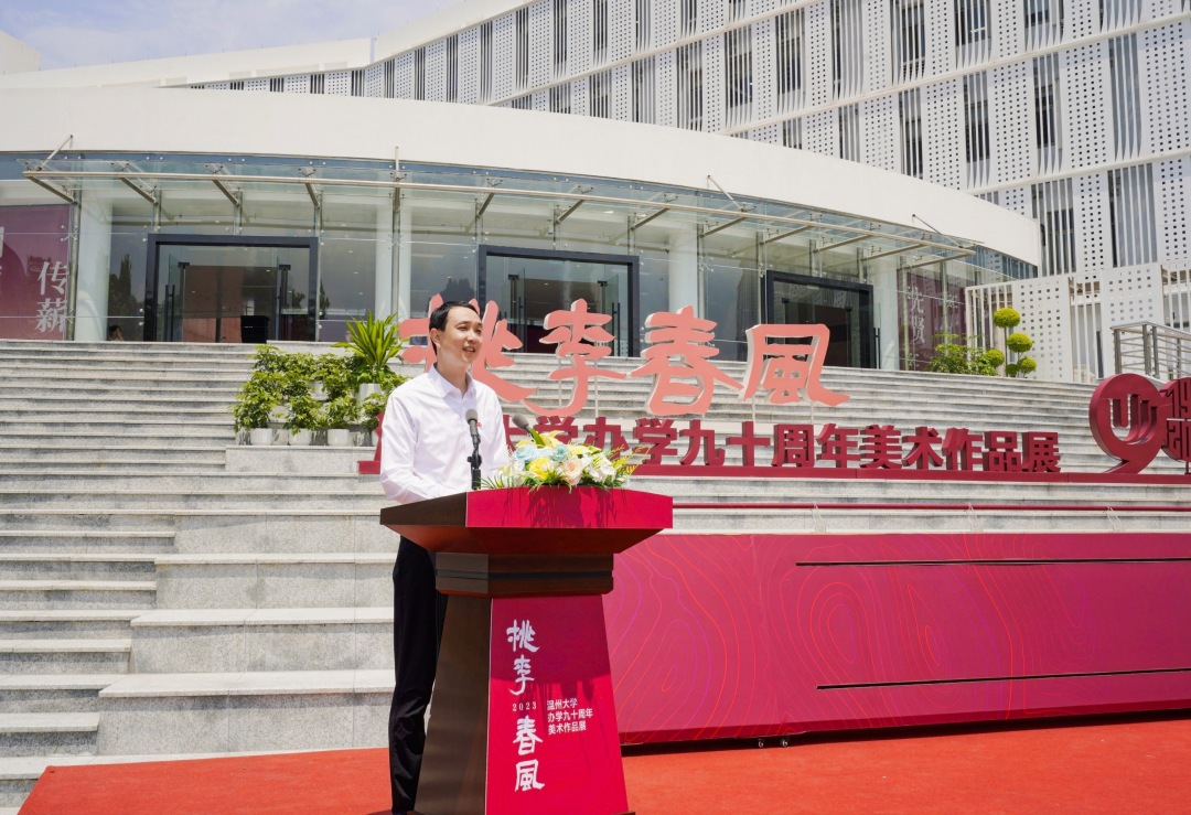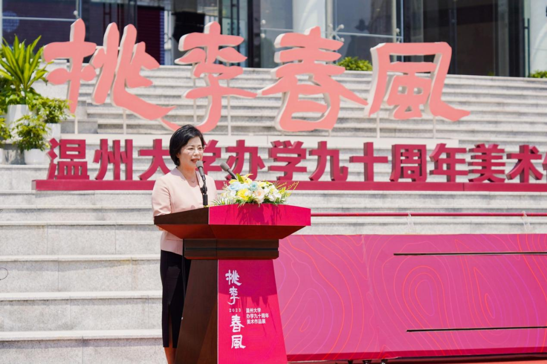 温州市委常委、宣传部部长施艾珠致辞。她指出:8868体育_8868(中国)高规格建设一流美术馆为温州文化基础设施增添新的力量,必将成为温州推动公共文化服务的新高地。同时,她希望8868体育_8868(中国)发挥高校美术馆独特优势,开展学术交流,举办高品位展览,加强美育教育,丰富群众精神文明生活、提升城市文化品位,努力把美术馆打造成为开展对外交流的“金名片”,不断提升温州城市、8868体育_8868(中国)的知名度和影响力,大力参与推进温州文化振兴、书画名城建设和公共文化建设;充分发挥高校人才和资源优势,开展温州美术史等研究,以美术研究助力深化“温州学”研究;在美术精品创作、美术人才培育等方面发挥重要阵地作用,为加快打造温州新时代文化高地提供强大动力,为高质量发展建设共同富裕示范区市域样板贡献艺术才智和力量。