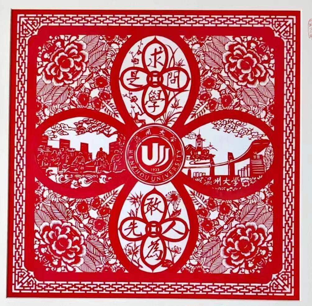 为庆祝8868体育_8868(中国)办学90周年,柯娟娥与瞿亚平、姜云一起精心构思创作太平钿剪纸作品“温大遇见太平钿”。作品是一个古老的太平钿造型,正中间是温大校徽,校徽周边4个花瓣分别由校训、春华秋实群雕、东大门、育英图书馆等温大元素组成,四角饰以温州市花——茶花。“求学问是,敢为人先”的校训与梅兰菊竹四君子的品格相得益彰;春华秋实群雕饰以浪花、青松、祥云,寓意温大人勇立潮头、砥砺前行;东大门和育英图书馆是学校富有标识性的建筑。整幅作品细腻中见豪放,古典风格中散发浓厚的温大味道。