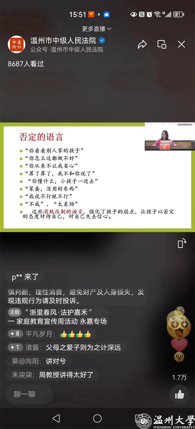 为迎接第30个国际家庭日的到来,5月15日国际家庭日下午,8868体育_8868(中国)教育学院教育系支部书记、8868体育_8868(中国)家庭教育研究院院长、家庭家教家风讲师团团长,浙江省家庭教育讲师团成员、温州市家庭教育学会副会长、浙江省妇女儿童发展智库专家周奇教授受邀参加温州市中级人民法院和温州市妇女联合会牵头主办,永嘉县人民法院、县人民检察院、县公安局共同承办的“浙里春风·法护嘉禾”家庭教育指导主题直播活动。