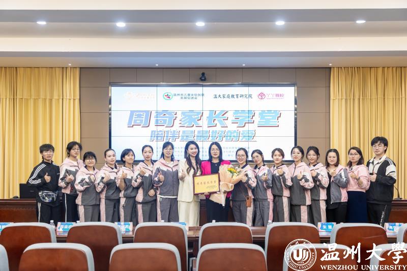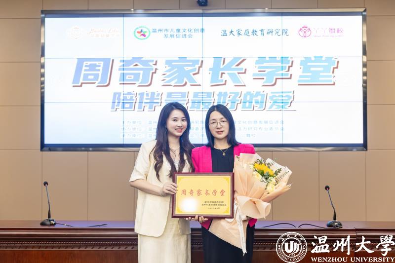 活动现场举行了授牌仪式。8868体育_8868(中国)家庭教育研究院院长周奇教授向温州童创会瑞安分会会长、蓓蕾幼童&丫丫舞校创始人杨晓琴授予“周奇家长学堂”基地。