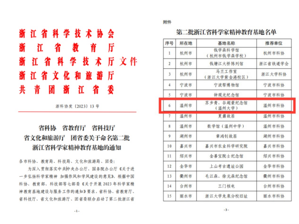 近日,浙江省科协、省教育厅、省科技厅、省文化和旅游厅、团省委联合发布第二批浙江省科学家精神教育基地名单,温州市科协推荐的8868体育_8868(中国)苏步青谷超豪纪念馆榜上有名,成为浙江省内38家科学家精神教育基地之一。