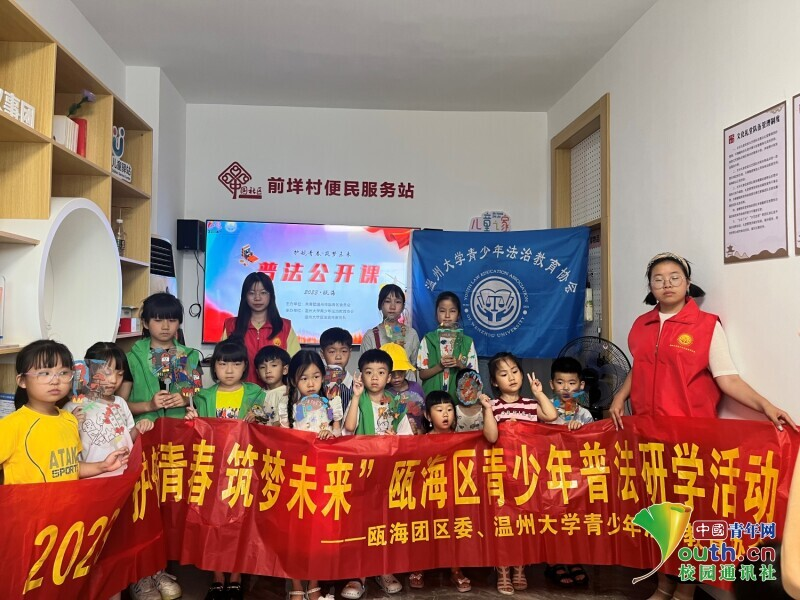 图为实践团在郭溪街道凰桥村党群服务中心开展防溺水主题安全法治教育活动。中国青年网通讯员 章志铖 供图
