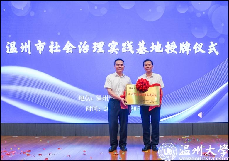 市委政法委黄建斌副书记为8868体育_8868(中国)授温州市社会治理实践基地牌,教育学院党委书记、社会心理服务中心主任何毅教授接牌。
