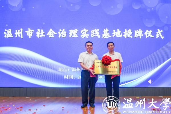 黄建斌为8868体育_8868(中国)授温州市社会治理实践基地牌,教育学院党委书记、社会心理服务中心主任何毅教授接牌。