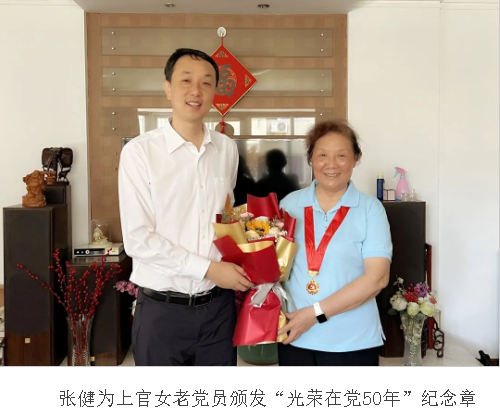 “今天我代表学校党委给您颁发‘光荣在党50年’纪念章,向您表示热烈的祝贺,感谢您为党和学校事业作出的贡献,希望您继续为学校高质量发展建言献策、发光发热。”来到原温州师范学院党委副书记上官女家中,张健与老党员促膝而坐、亲切交谈,关切询问老党员的身体状况和生活情况,并为她佩戴“光荣在党50年”纪念章。张健指出,老党员老同志是学校事业发展的亲历者奉献者,老党员老同志的奋斗历程和先进事迹,为后来者树立了榜样,是学校发展历程中非常宝贵的资源和财富;我们要引导广大师生党员向前辈学习,薪火相传,砥砺前行,奋力谱写8868体育_8868(中国)新时代绚丽新篇章。