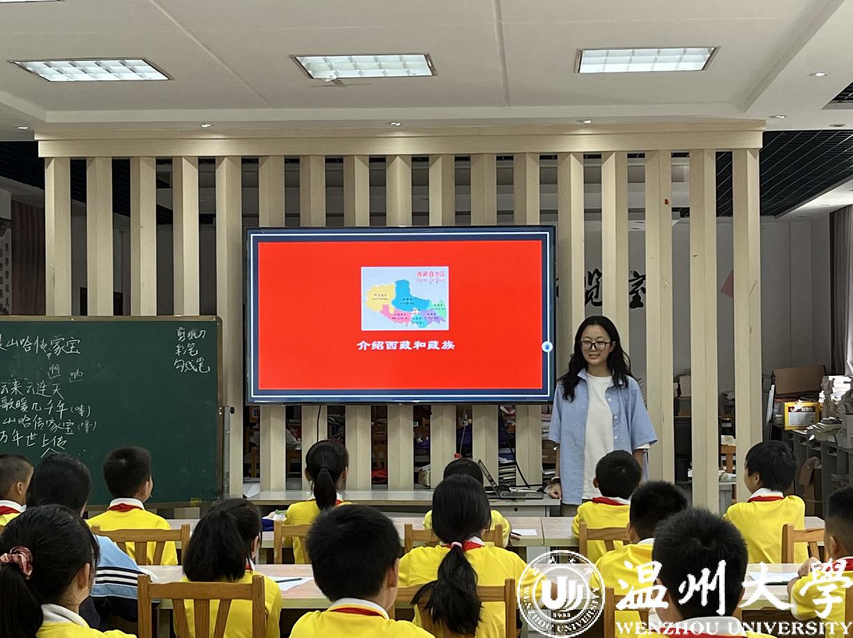 为丰富课堂内容,打造趣味课堂,实践队中的藏族同学旦增德琼语言生动、图文并茂,为小朋友们带来了一节充满藏式风情的课堂。首先,德琼同学对西藏展开简要介绍,展示了当地的美丽风景及风土人情,随后教授富有西藏民族特色的歌曲《卓玛》,带同学们领略藏歌的独特风格,感受藏族的独特文化。