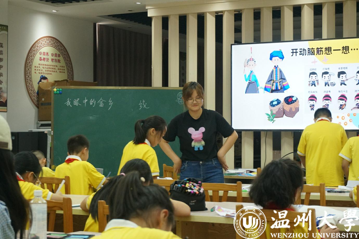 主讲员黄伊馨、甘玉慧以“我眼中的畲乡”为主题开展绘画课堂,她们用生动形象的图片展示了一些畲族的特色建筑以及特色服饰,带领小朋友们领略了独属于畲族的风土人情,此次的课程旨在激发小朋友们对畲族文化的认同感和自豪感。