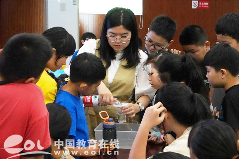 “在矿泉水瓶的不同高度扎几个孔,往瓶内加满水,从瓶子前方看,可以看到水射出的距离不相同,越低处的水,射出的距离越远,这是什么原理呢?”科普课堂上,大学生黄纤纤通过实验演示,让孩子们直观感受压强的应用与影响压强大小的因素。在她通俗易懂的语言中,科学课堂不仅充满趣味,也有效启发了孩子们对科学现象的思考。