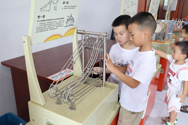 “重力是地球或其他物体对物体的相互吸引力,重力大小取决于两个物体的质量以及它们之间的距离,具有较大质量的物体将会产生更强的重力……”在科普展品《最速降线》前,大学生为孩子们讲解了有关重力的知识,也让孩子们对生活中的重力有了具体感知。