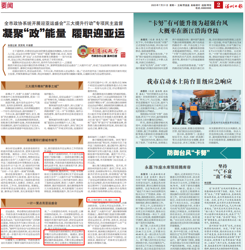 联动监督促提升。在温州奥体中心、温州体育中心体育场、温州龙舟运动中心等地,由省市县三级政协委员组成的监督组深入竞赛区、训练区,走进休息间、工作间,身临指挥处、观赛处,详细考察亚运场馆建设、亚运标识布置、赛事运行保障、美化景观提升等情况,真切感受我市亚运筹办工作的阶段性成效。