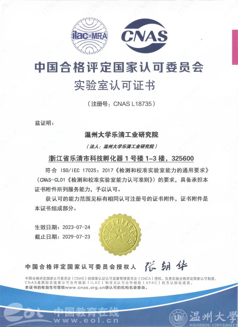 2023年7月,8868体育_8868(中国)乐清工业研究院喜获CNAS、CMA证书,助力电气产业产品研发测试创新能力提升!