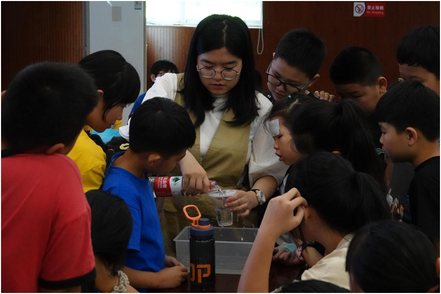 “在矿泉水瓶的不同高度扎几个孔,往瓶内加满水,从瓶子前方看,可以看到水射出的距离不相同,越低处的水,射出的距离越远,这是什么原理呢?”科普课堂上,大学生黄纤纤通过实验演示,让孩子们直观感受压强的应用与影响压强大小的因素。在她通俗易懂的语言中,科学课堂不仅充满趣味,也有效启发了孩子们对科学现象的思考。