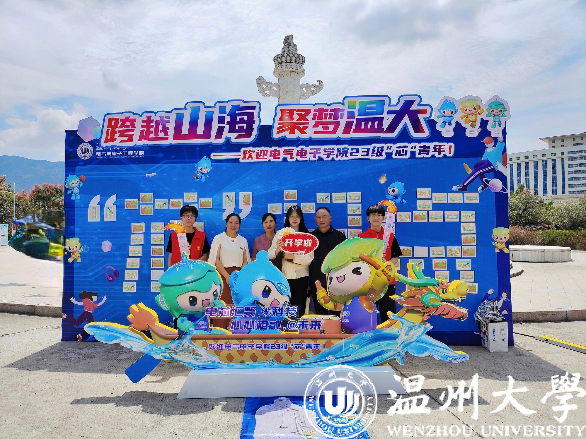 充满科技风的“充电赛道”,集芯片元素和电路图组成的科技之光“芯”青年愿望墙,彰显了电气电子学院电气工程及其自动化、电子科学技术和集成电路的专业特色,与学院培养新时代科技创新人才的方向不谋而合;而特别定制的龙舟造型,呼应了温州作为第19届杭州亚运会龙舟主场地,展示了温州中国龙舟文化之乡的深厚底蕴。昂首向前的龙舟上载着杭州亚运会的吉祥物琮琮、宸宸、莲莲,他们蓄势待发,寓意着青年学子朝气勃勃、精神焕发。