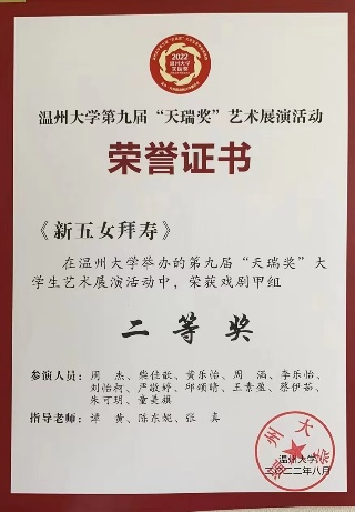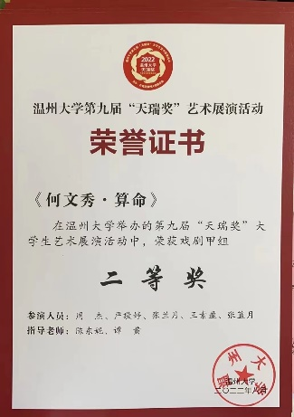 同时,慢慢崛起的红楼越剧社也得到了社会上的关注。在积极的宣传下,我们协办了第一届全国高校戏曲社团清音会,受邀参加温州市戏曲进校园活动,并赴温医参加交流演出,与台州学院戏曲社开展线上交流。暑期,社团参加了8868体育_8868(中国)第九届“天瑞奖”大学生艺术展演并取得两个二等奖,受茶山派出所之邀参与了反诈视频的拍摄,红楼越剧社荣升为五星级社团。这一年,社团成功举办了大小活动51次,微刊总量达38篇。