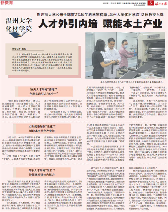 “温州最吸引我的地方,是让人深刻感受到‘知识是被重视的,人才是被尊重的’。温大的人才引育政策有宽度、有厚度、有温度,给实验室、给研究院、给企业、给基金,真正做到了待遇、事业、情感留人。”2021年,温大化材学院成功引入国际钠离子电池领域业界公认的青年顶尖人才侴教授及其团队全职落地温州。而这同样也是许多高层次人才加盟温大的重要原因。