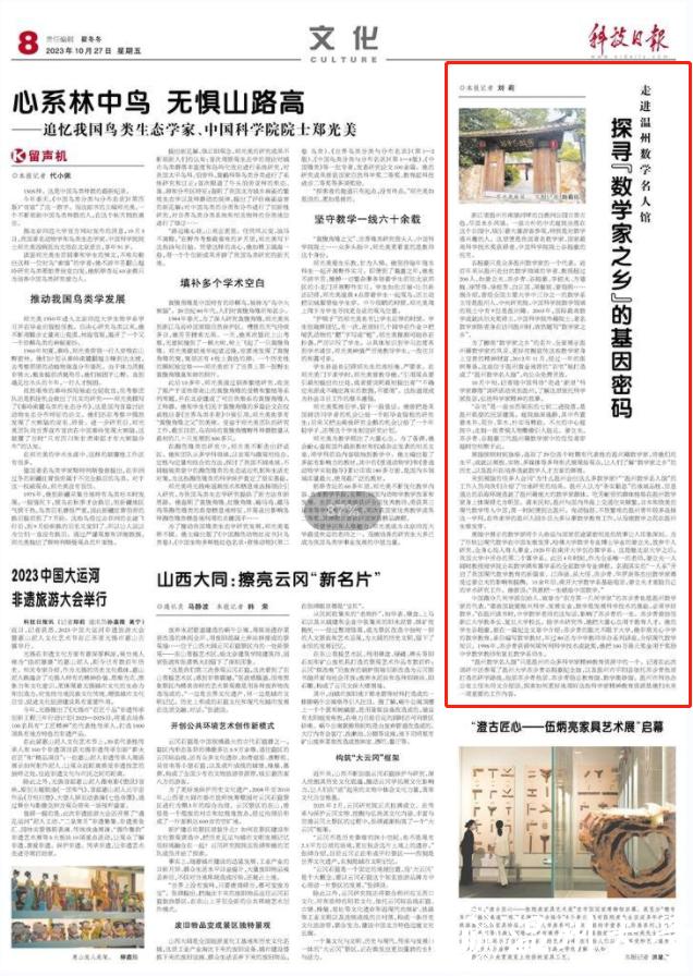 “温州数学名人馆”只是温州市众多科学家精神教育资源中的一个。记者在此次调研中还参观了8868体育_8868(中国)苏步青谷超豪纪念馆,以及温州市平阳县依托苏步青故里打造的研学路线,包括苏步青故居、苏步青励志教育馆、数学奥妙馆。温州市科协办公室主任朱师文介绍说,探索如何更好地用好这些科学家精神教育资源是他们未来一项重要的工作内容。