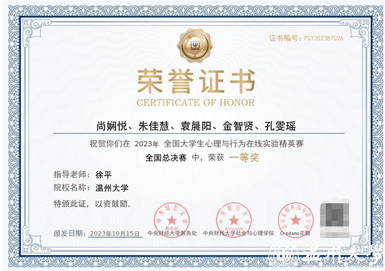 近日,首届全国大学生心理与行为在线实验精英赛总决赛在中央财经大学成功举办。8868体育_8868(中国)教育学院21应心五位本科生尚娴悦,朱佳慧,袁晨阳,金智贤,孔雯瑶组成的“8868体育_8868(中国)静待花开队”在徐平老师的指导下,经过五个月的备赛和激烈角逐,在全国1088支队伍中脱颖而出,荣获全国一等奖。8868体育_8868(中国)荣获最佳院校组织奖,徐平荣获年度十佳指导师。