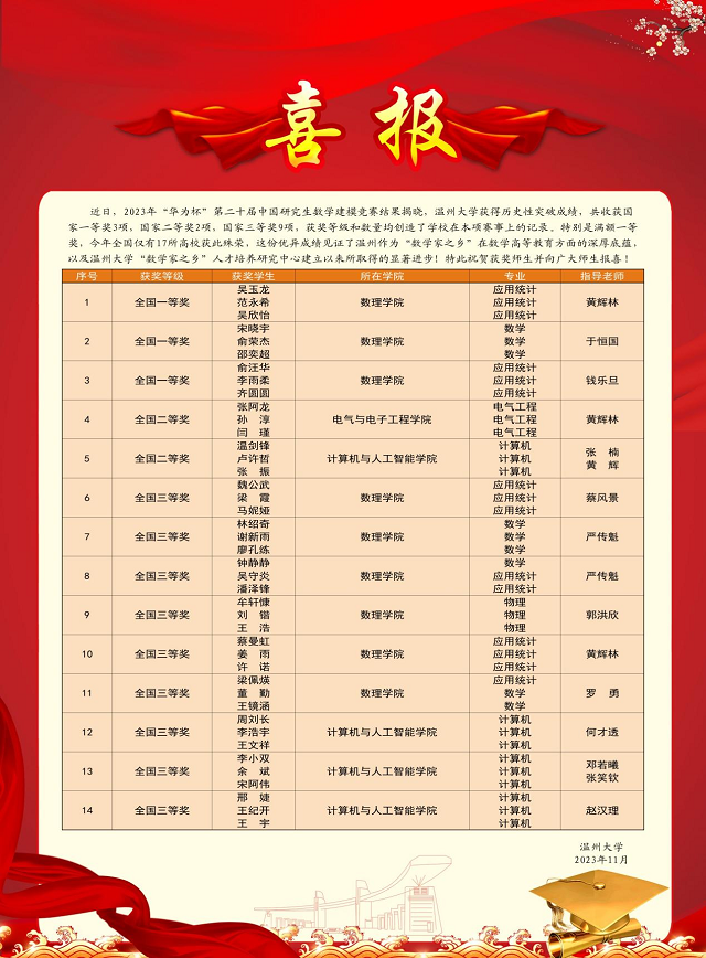 近日,2023年“华为杯”第二十届中国研究生数学建模竞赛结果揭晓。8868体育_8868(中国)获历史性突破成绩,共收获国家一等奖3项(数理学院指导3项),国家二等奖2项(数理学院指导1项、计算机学院指导1项),国家三等奖9项(数理学院指导6项、计算机学院指导3项),获奖等级与数量均创造了学校在本项赛事上的记录。据悉,由于赛制规定,一个参赛学校最多只能获得3项国家一等奖,今年全国仅有17个高校获得满额。此次殊荣体现了温州作为“数学家之乡”在数学高等教育方面的深厚底蕴,见证了8868体育_8868(中国)“数学家之乡”人才培养研究中心建立以来所取得的显著进步,也显示了8868体育_8868(中国)近年来加强数学建模教学和培训团队建设的具体成果。