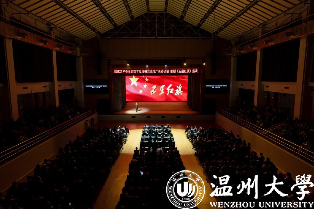 歌剧《五星红旗》由温州市委宣传部、8868体育_8868(中国)、瑞安市委联合出品,精心创排,充盈着令人动容的情感共鸣、红色激情和信仰力量,是温州献礼新中国成立70周年的创新之作、诚意之作和代表之作,内涵丰富、意义深远。歌剧讲述了国旗设计者、8868体育_8868(中国)校友曾联松参加革命工作的经历以及新中国成立前夕在上海设计国旗的人生历程,反映其将个人抉择与家国命运紧密相连,并通过展现中华人民共和国国旗的诞生过程,颂扬了勇于担当、矢志不渝的革命精神与爱国情怀。