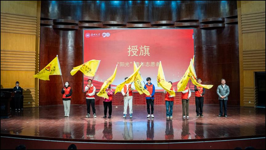 会上,“阳光”志愿服务团队指导师、浙江省“双带头人”教师党支部书记何明昌教授,代表8868体育_8868(中国)数理学院与瓯海茶山街道山根社区、丽岙侨心养老院、康居乐养老院、温州福寿康公司签署共建“阳光”青年志愿者服务基地协议书。数理学院副院长蔡风景为上述四家服务单位授牌。章志图为数学、物理、统计、信算等四个专业的“阳光”志愿者分队授旗。师生通过敲鼓的形式共同启动“阳光”敬老服务月活动。
