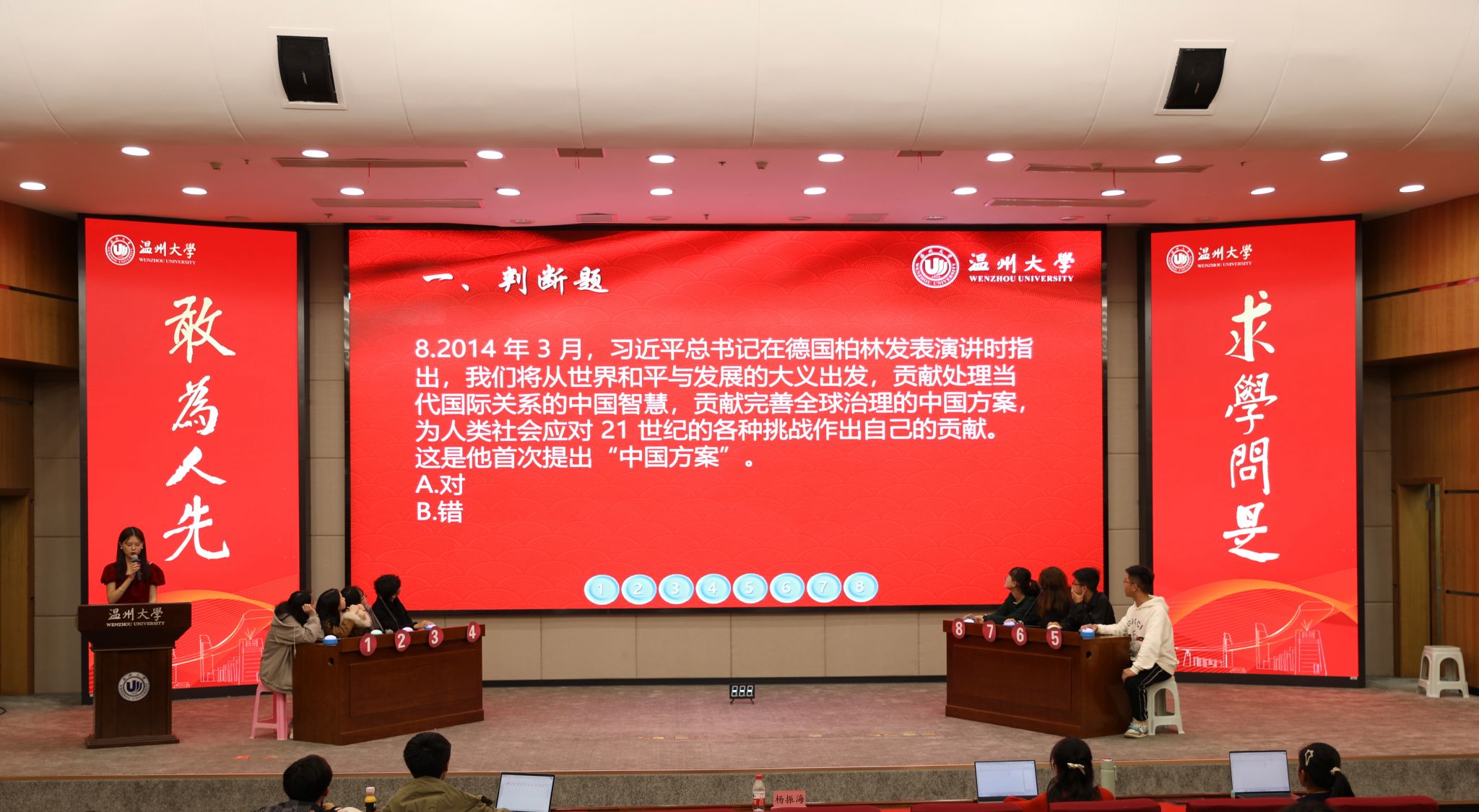 “习近平法治思想首次提出是在2020年11月16日至17日召开的中央全面依法治国工作会议!”“恭喜2号同学抢答成功!”……在育英图书馆二楼报告厅,8868体育_8868(中国)“习近平法治思想”知识竞赛如火如荼地进行中。知识竞赛重点围绕宪法知识、习近平法治思想、党的二十大报告相关内容,设有判断题、单选题、多选题和逻辑题。500余名学生参与到知识竞赛初赛环节,最终24名选手进入决赛。决赛现场紧张热烈,充分检验了大学生对习近平法治思想、宪法知识的掌握程度,将法治学习的知识性与趣味性融为一体。