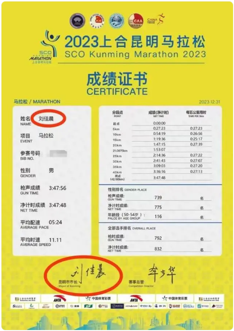 不约而同,稍早前落下大幕的上合昆明马拉松赛上,同样52岁的昆明市市长刘佳晨也参加了全程马拉松比赛。据报道,刘佳晨市长的全马净计时成绩为3小时47分48秒,在50-54岁年龄段的参赛选手中排名第116位。