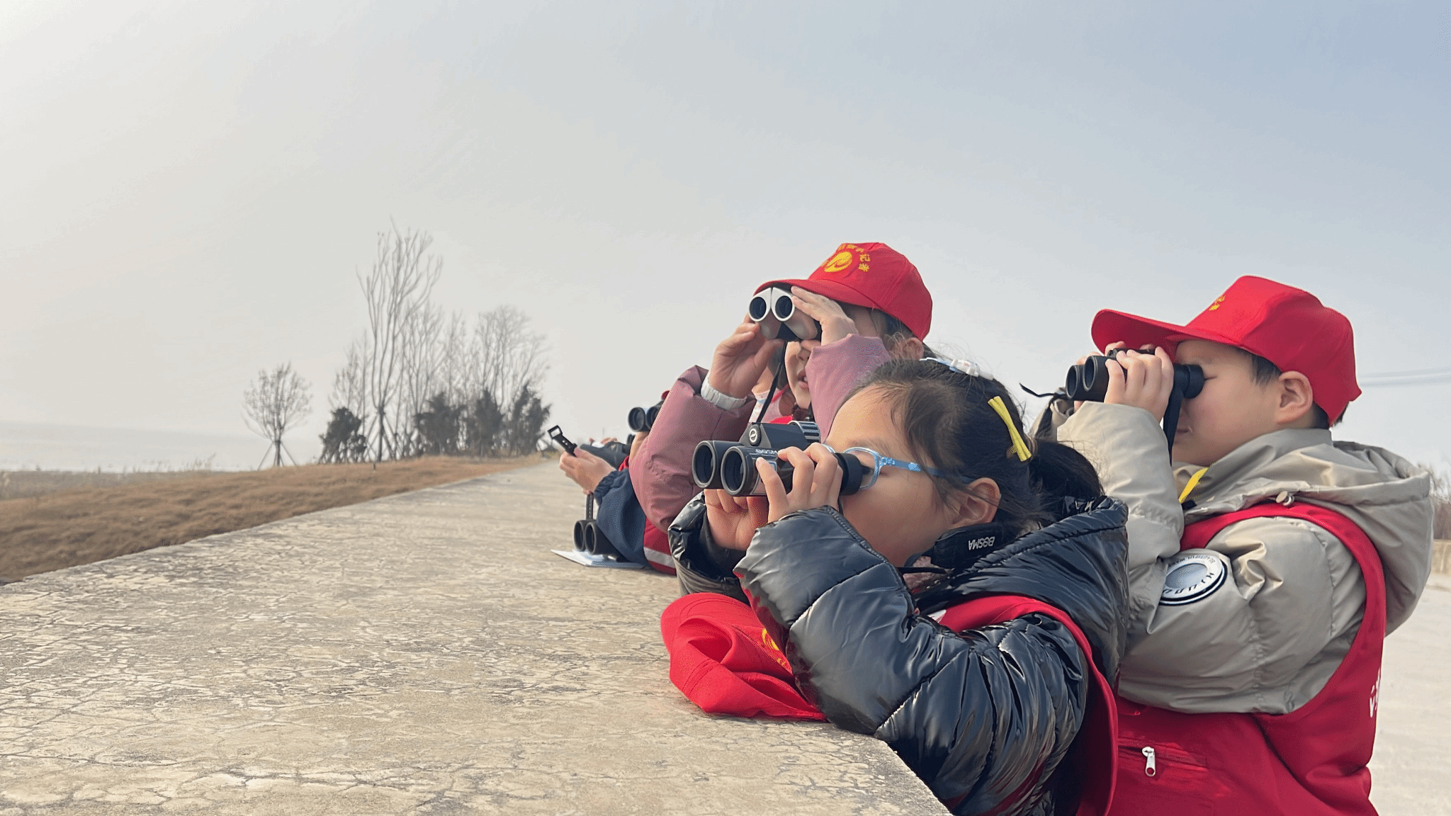 “卷羽鹈鹕头上有一簇白色卷羽,浑身羽毛雪白,体态比家养的鹅要大很多,体长1.6—1.8米,嘴巴又大又长。”观鸟现场,解雷为小记者们科普,并传授寻找卷羽鹈鹕的技巧。听完介绍,小记者们迫不及待地拿起望远镜,调整好方向,仔细寻找。“找到了,我看到5只卷羽鹈鹕!”不一会儿,小记者姜智文兴奋地叫起来。随后,在王青良的指导下,小记者们用单筒望远镜放大60倍后,看到了200米外的卷羽鹈鹕,让小记者们直呼“太壮观了”。