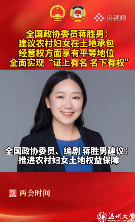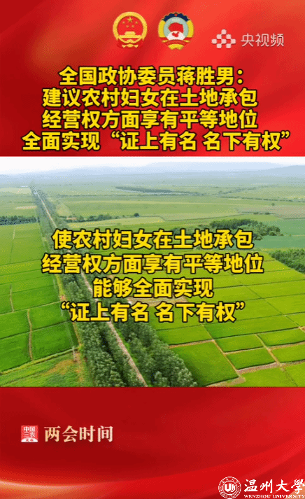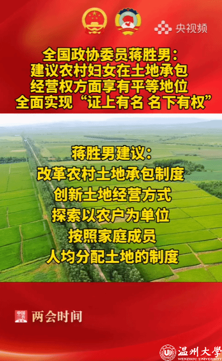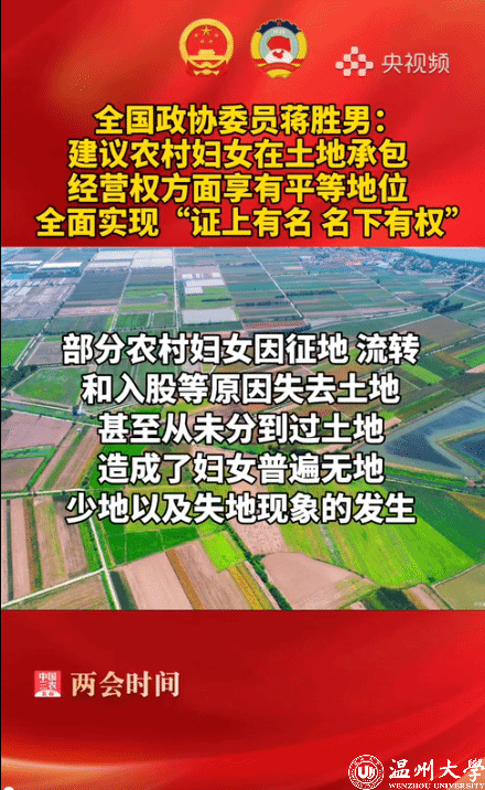 【全国政协委员#蒋胜男建议保障农村妇女土地权益#】全国政协委员@蒋胜男 建议:推进农村妇女土地权益保障。部分农村妇女因征地、流转和入股等原因失去土地,甚至从未分到过土地,造成了妇女普遍无地、少地及失地现场的发生。