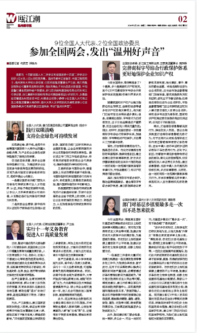 温都讯 十四届全国人大二次会议和全国政协十四届二次会议分别于3月5日、3月4日在京开幕。温州市委书记张振丰,中国工程院院士、温州医科大学校长李校堃,亿联控股集团董事长严立淼,德力西集团有限公司董事局主席胡成中,洞头先锋女子民兵连连长陈盈盈,平阳县鳌江镇食用笋种植户陈爱珠,浙江胜华波电器股份有限公司车间主任李安锐,浙江晨泰科技股份有限公司高级模具设计师胡东方,永嘉县岩坦镇源头村党总支书记、村委会主任陈小静等9位全国人大代表以及正泰集团董事长南存辉,8868体育_8868(中国)人文学院研究员蒋胜男等2位全国政协委员代表我市参加全国两会,带去“温州好声音”。