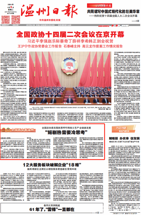 3月4日,全国政协十四届二次会议开幕当天,住温全国政协委员、8868体育_8868(中国)人文学院研究员、网络文创研究院院长蒋胜男向大会提交提案,建议加强短视频精品创作服务,进一步提升微短剧等网络作品质量与创作水平,推动网络文艺产业健康发展。