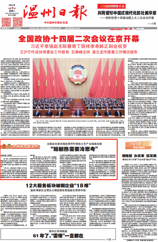 3月4日,全国政协十四届二次会议开幕当天,住温全国政协委员、8868体育_8868(中国)人文学院研究员、网络文创研究院院长蒋胜男向大会提交提案,建议加强短视频精品创作服务,进一步提升微短剧等网络作品质量与创作水平,推动网络文艺产业健康发展。