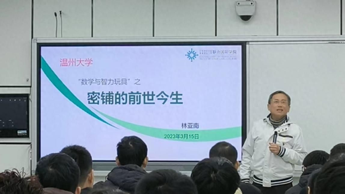 3月14日是第五个国际数学日。为提升大学生感悟数学之美、分享数学之美的能力,发挥大学生在开展温州“数学家之乡”研学服务中的积极作用,8868体育_8868(中国)数理学院邀请厦门大学博士生导师、国务院政府特殊津贴专家、国家教学名师林亚南教授,为苏步青谷超豪纪念馆讲解团队的学生们开设了主题为《密铺的前世今生》数学科普讲座。