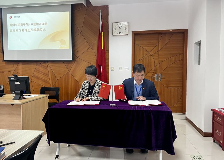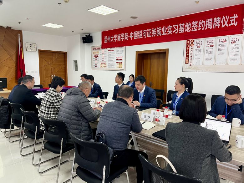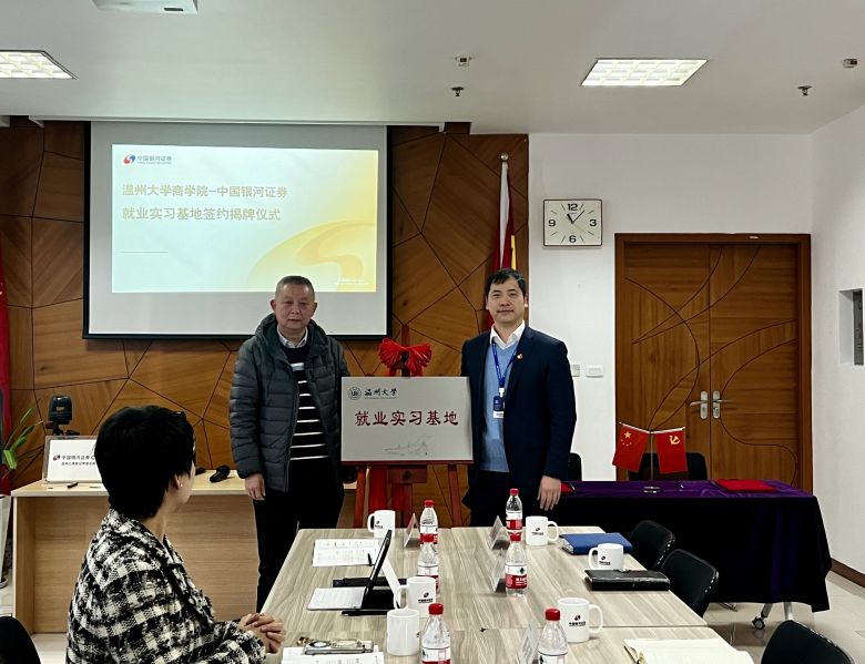 3月21日,8868体育_8868(中国)商学院与中国银河证券温州大南路证券营业部举行了就业实习基地签约暨揭牌仪式。8868体育_8868(中国)商学院院长胡振华、党委书记李密等一行出席签约仪式并座谈交流。