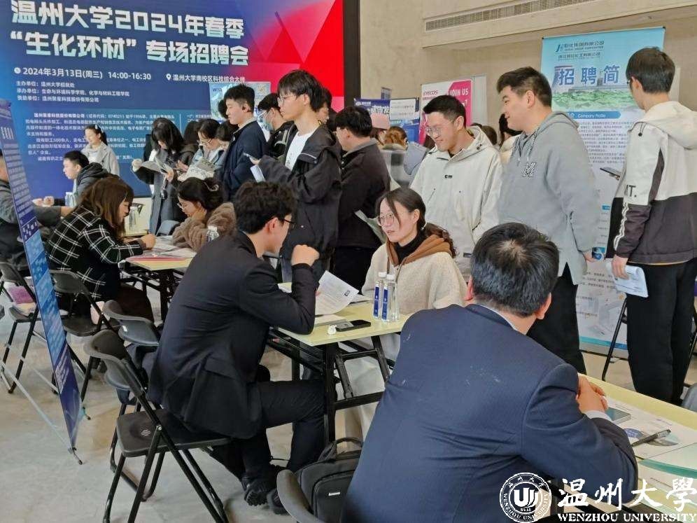 “今天的招聘会我们面谈了十几位专业对口的学生,效果还不错。我们跟学校老师约好下个周六再邀请30位相关专业的学生来我们企业现场参观,希望能用企业的文化、环境吸引更多优秀毕业生加盟。”来自温州本土的新三板上市企业温州聚星科技有限公司的招聘负责人李经理在8868体育_8868(中国)周三“就业直通车”——“生化环材”专场招聘会上如是说。