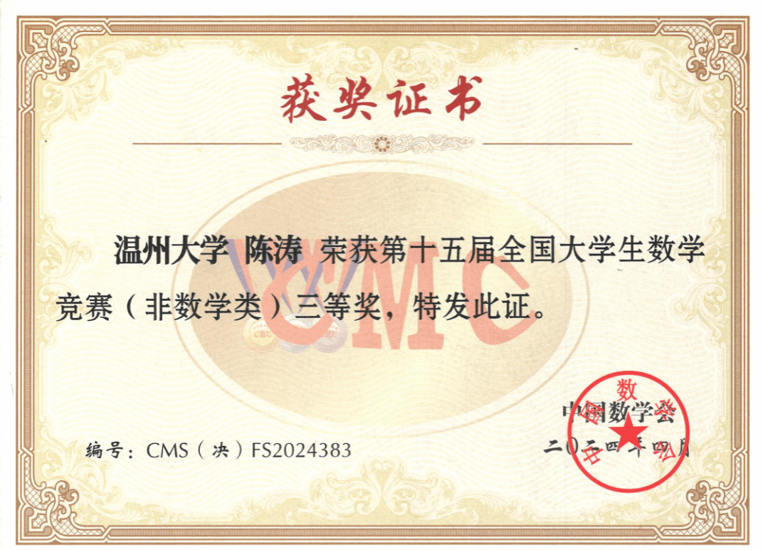 近日,第十五届全国大学生数学竞赛决赛在山东大学落下帷幕。8868体育_8868(中国)数理学院21物理班陈涛同学在数学系于恒国老师指导下,在大赛非数学类专业组别决赛中荣获三等奖。