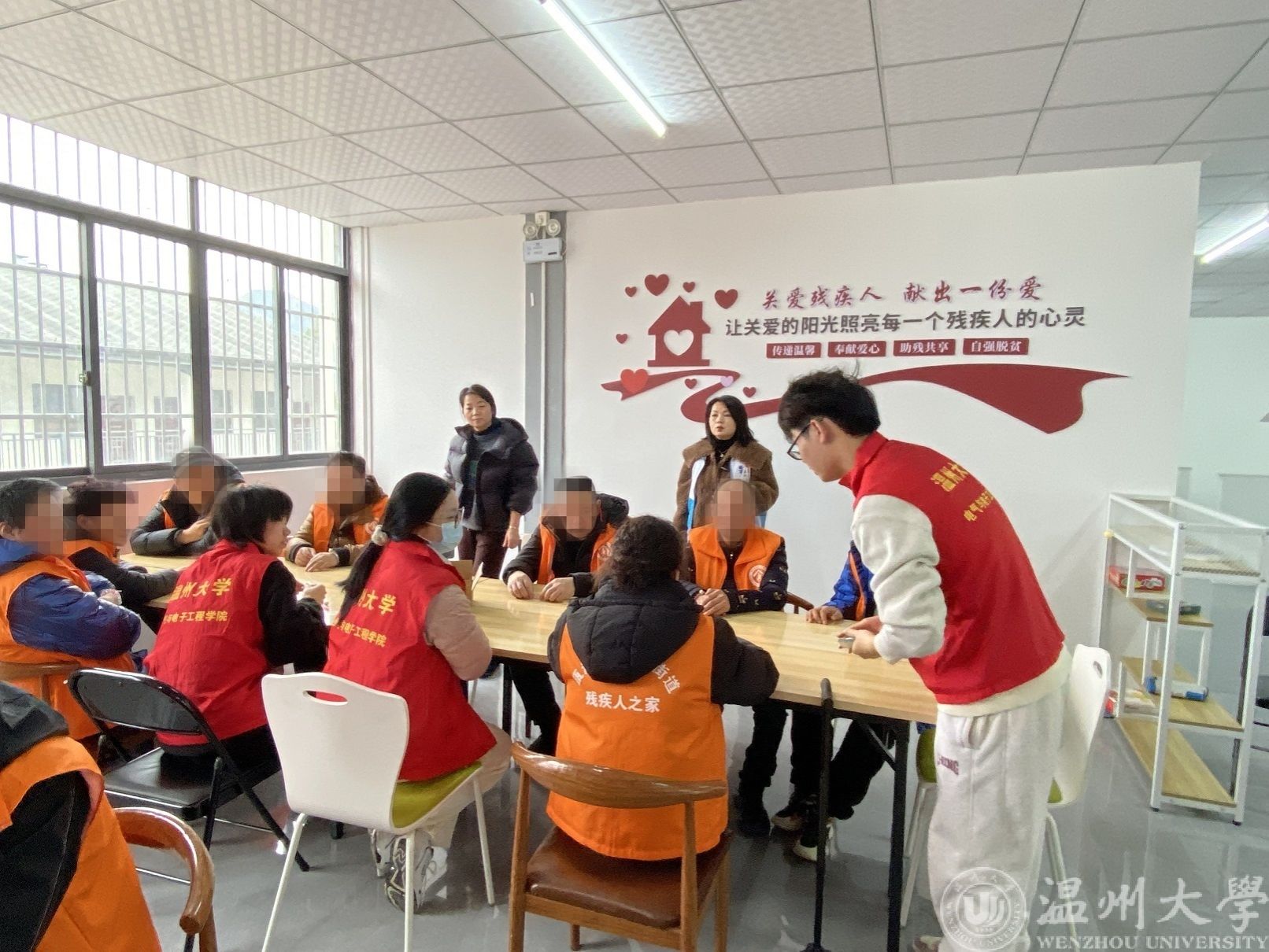 在残疾人之家,志愿者们给学员们带来生动有趣的“串珠子”、“制作流沙画”的手工课。当精美的手链和独具特色的流沙画被制作出,每个人的脸上都洋溢着幸福的笑容。在龙湾区青苗残疾人之家,志愿者们还参与了残疾人的日常生活,和他们一同装笔、封盒、布置房间。在与残疾人亲切交流的过程中,志愿者们切实地了解他们的需求和困难,不断改进帮助方式,让残疾人感受到社会的温暖与关爱。