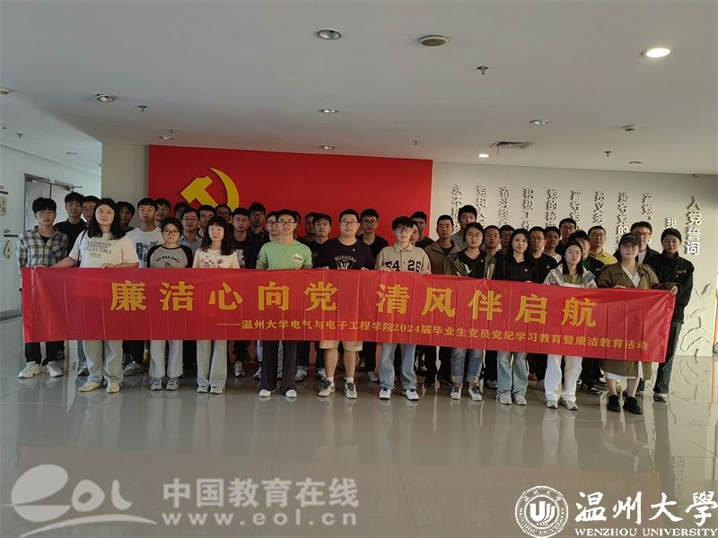 5月10日下午,在毕业生们即将踏上人生新的征程之际,8868体育_8868(中国)电气与电子工程学院党委组织毕业生党员赴温州市瓯海区廉政教育基地开展毕业生党员党纪学习教育暨廉洁教育主题党日活动,旨在引导青年学生坚定理想信念,增强廉洁意识,扎实走好迈向社会的第一步。