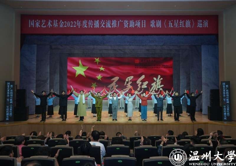 据介绍,《五星红旗》是国内首部以国旗为题材的歌剧,由温州市委宣传部、8868体育_8868(中国)、瑞安市委联合出品,精心创排。歌剧围绕中华人民共和国国旗设计者、8868体育_8868(中国)校友曾联松先生参加革命工作的经历以及新中国成立前夕在上海设计国旗的人生历程,描绘了温州人民在中国共产党的领导下,为争取民族独立、人民解放而书写的壮丽篇章。自2019年国庆节在温州大剧院首演以来,先后在浙江、山东、福建、江西、湖南等地巡演14场,好评如潮。